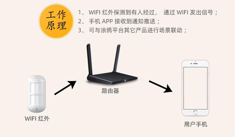 概述:wifi紅外探測(cè)到人體經(jīng)過,通過WIFI發(fā)送信號(hào),手機(jī)APP接收到推送,可與涂鴉其他產(chǎn)品聯(lián)動(dòng)。